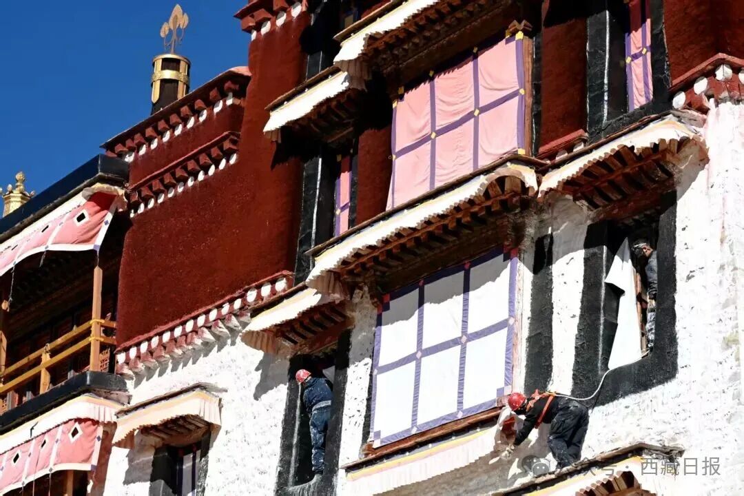 10月22日,阳光之城拉萨苏醒了。阳光温柔地照在布达拉宫上。一场延续了三百多年的传统“盛装仪式”在这里热闹地恢复。按照“旧规”,每年藏历九月左右,当拉萨雨季结束、寒冷不深时,布达拉宫的彩绘工作就如期开始。将以白灰、红土、黄土等天然原料为基础。统一配方制成的涂料,不仅能牢固地附着在墙壁上,抵御风吹日晒,还能使宫墙保持光亮如初。来自世界各地的人们在这里相聚。行宫管理宫的工作人员就像“蜘蛛侠”,拿着喷枪,把坑围在墙中间,各族人民排队收集材料、运输、粉刷墙壁,有条不紊。广东游客脱掉上衣,脸依旧墙上还挂着尚未干的油漆。他微笑着说,他在拉萨生活了两个月,下午很快就会回来。 “参与粉刷墙壁,为我的西藏之行画上了完美的句号。”在布宫后面的树荫下,来自拉萨的阿旺用对讲机指挥搬运油漆的人们。他说:“我每年都会来,以前需要半个月左右,现在容易了。”随着搅拌和喷涂设备越来越好,分工越来越规范,涂装只需要一周的时间。 “布达拉宫粉刷墙壁的活动预计需要一周左右的时间,当你路过皇宫的时候,记得看看这座千年古迹是如何变身的。我们将于近期进行直播,邀请大家在线体验这场“装扮仪式”。